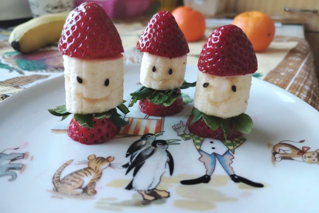 Клубнику нужно тщательно вымыть, особенно листья – их не обрываем, они понадобятся. Разрезаем каждую ягоду (в зависимости от формы и размера) либо пополам, либо в соотношении 1/3 к 2/3. Часть с листиками ставим на блюдо. Потом разрезаем банан на части примерно по 2 см и ставим их на клубнику. Из семян черного кунжута делаем «глазки», зубочисткой рисуем «рот». А сверху «надеваем» «шапки». Готово!