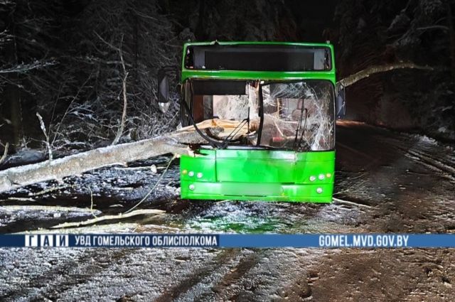 Как сообщает УГАИ УВД Гомельского облисполкома, рейсовый автобус следовал по маршруту Гомель – Зябровка. За рулем находился 49-летний водитель. В какой-то момент на транспортное средство упало дерево. В момент происшествия в салоне находились пассажиры. Ни водитель, ни пассажиры не пострадали.