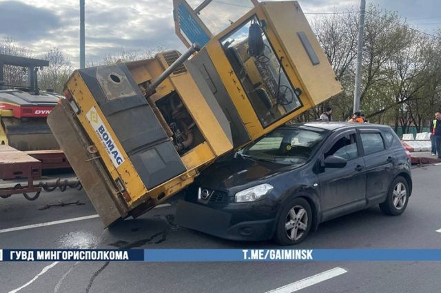 53-летний водитель асфальтового комбинированного катка, двигаясь вблизи здания №88 по улице Богдановича, во время заезда на длинномерное транспортное средство DAF не учел его габариты. В результате каток опрокинулся на легковой автомобиль Nissan, стоящий во второй полосе для движения в попутном направлении.