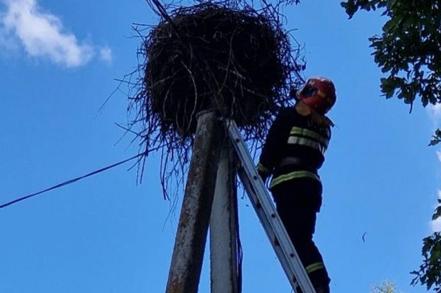 Работники МЧС поднялись по лестнице к гнезду, извлекли аиста и перерезали веревку. Птица в ветеринарной помощи не нуждалась.