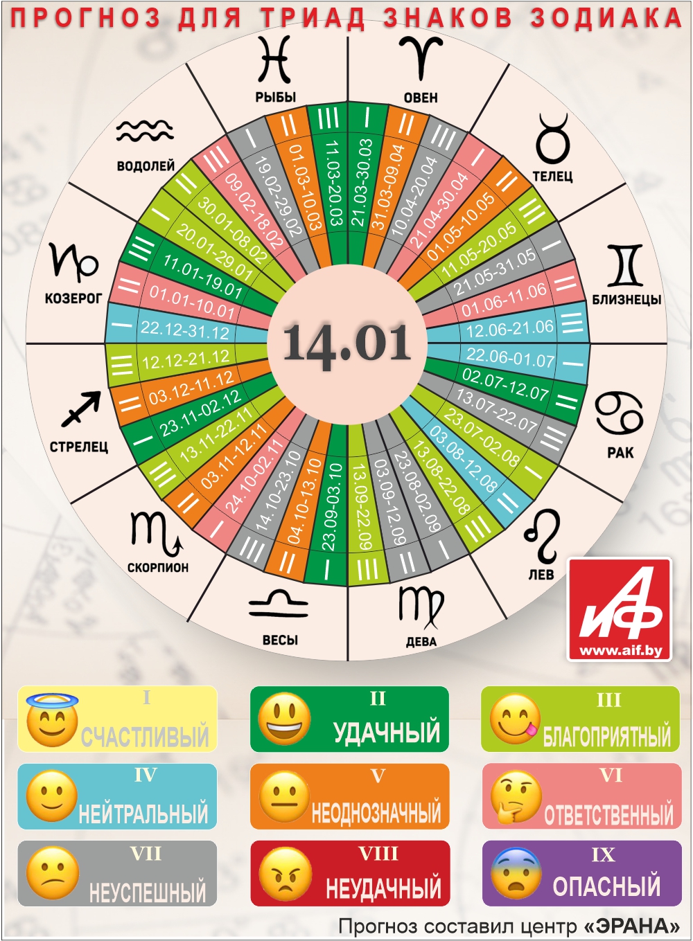 Специалисты центра «ЭРАНА» для точности прогноза представителей каждого знака зодиака делят на три типа по дате рождения, так называемые триады. Каждый из них имеет свои отличительные черты характера и особенности в прогнозах.