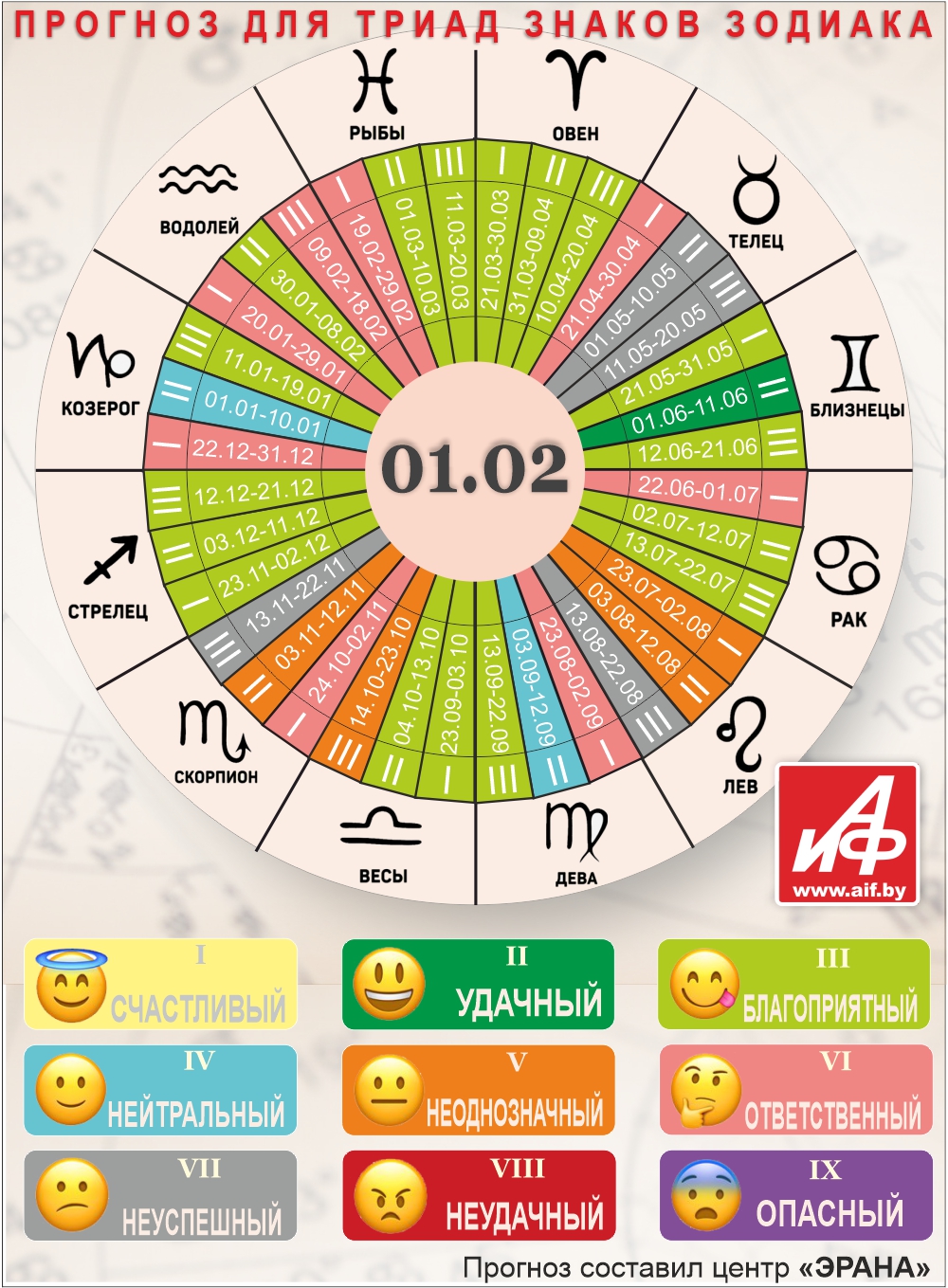 Специалисты центра «ЭРАНА» для точности прогноза представителей каждого знака зодиака делят на три типа по дате рождения, так называемые триады. Каждый из них имеет свои отличительные черты характера и особенности в прогнозах.