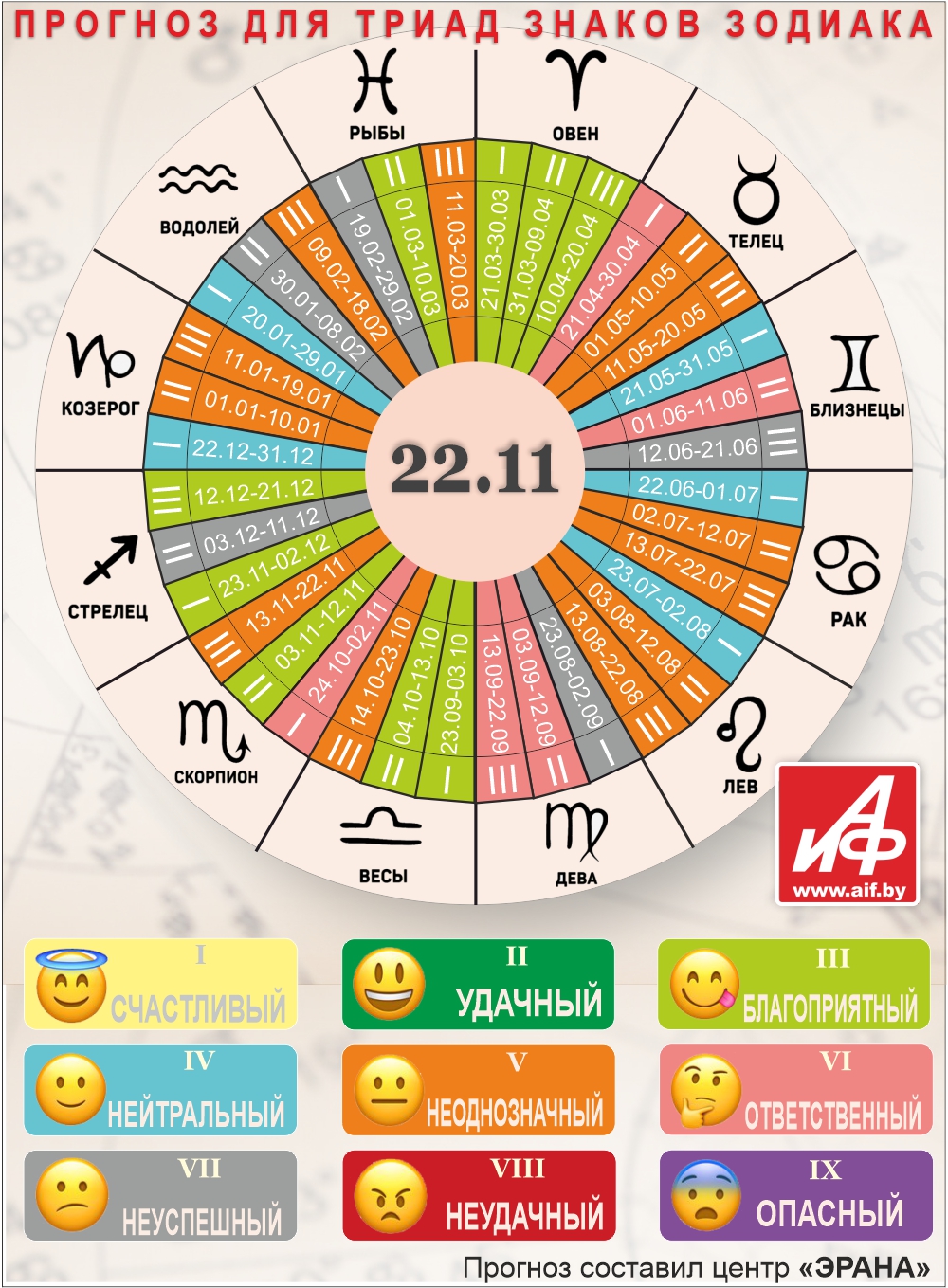 Специалисты центра «ЭРАНА» для точности прогноза представителей каждого знака зодиака делят на три типа по дате рождения, так называемые триады. Каждый из них имеет свои отличительные черты характера и особенности в прогнозах.