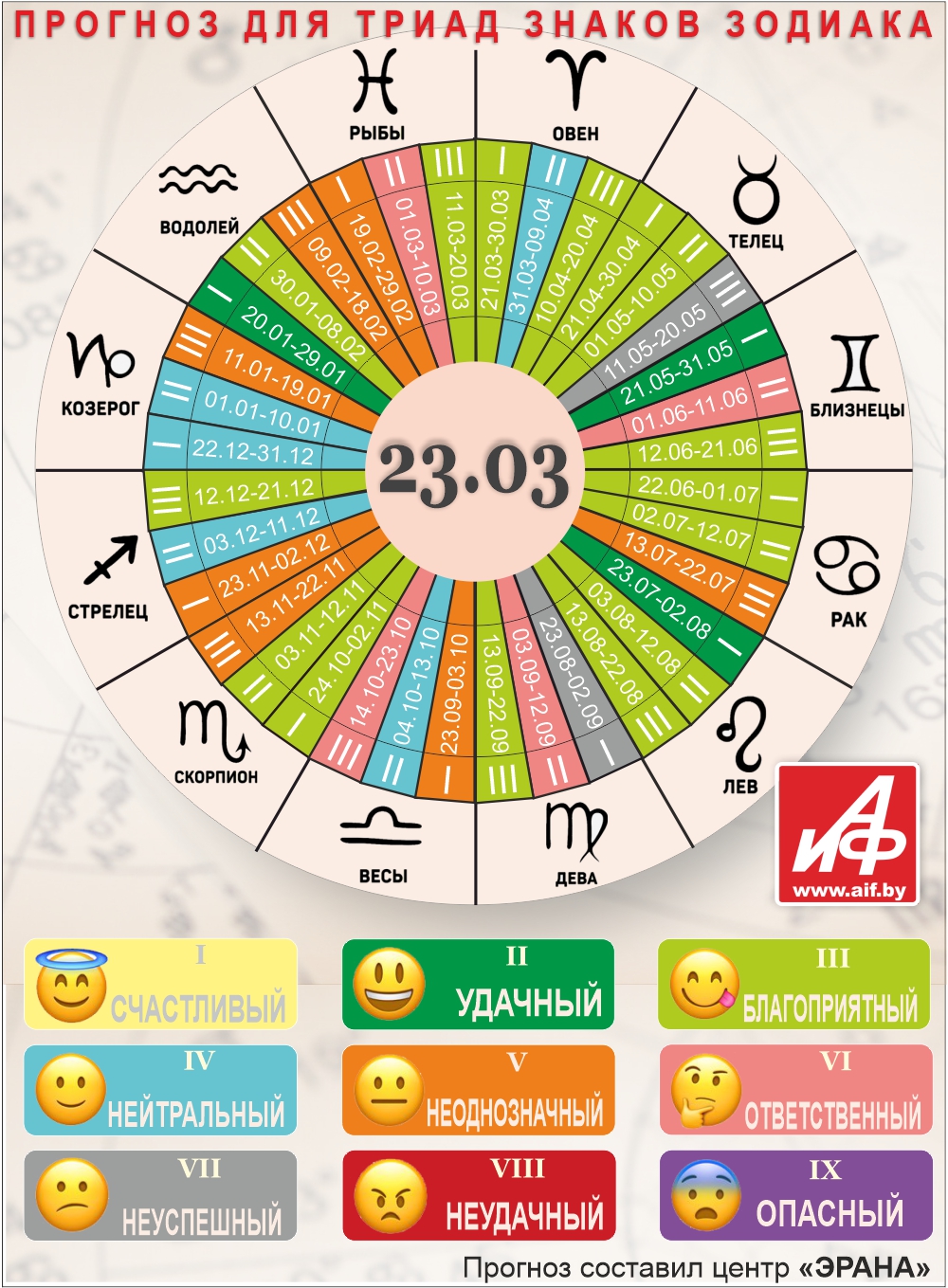 Специалисты центра «ЭРАНА» для точности прогноза представителей каждого знака зодиака делят на три типа по дате рождения, так называемые триады. Каждый из них имеет свои отличительные черты характера и особенности в прогнозах.
