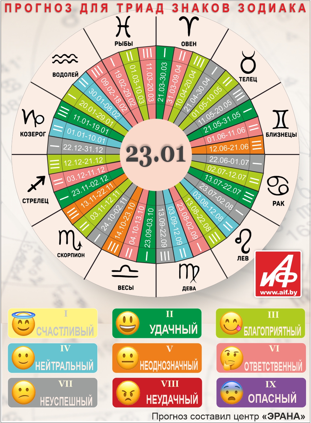 Специалисты центра «ЭРАНА» для точности прогноза представителей каждого знака зодиака делят на три типа по дате рождения, так называемые триады. Каждый из них имеет свои отличительные черты характера и особенности в прогнозах.