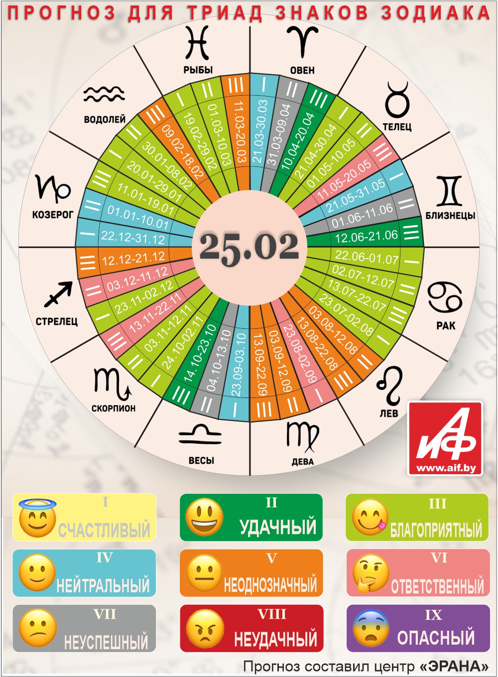 Специалисты центра «ЭРАНА» для точности прогноза представителей каждого знака зодиака делят на три типа по дате рождения, так называемые триады. Каждый из них имеет свои отличительные черты характера и особенности в прогнозах.