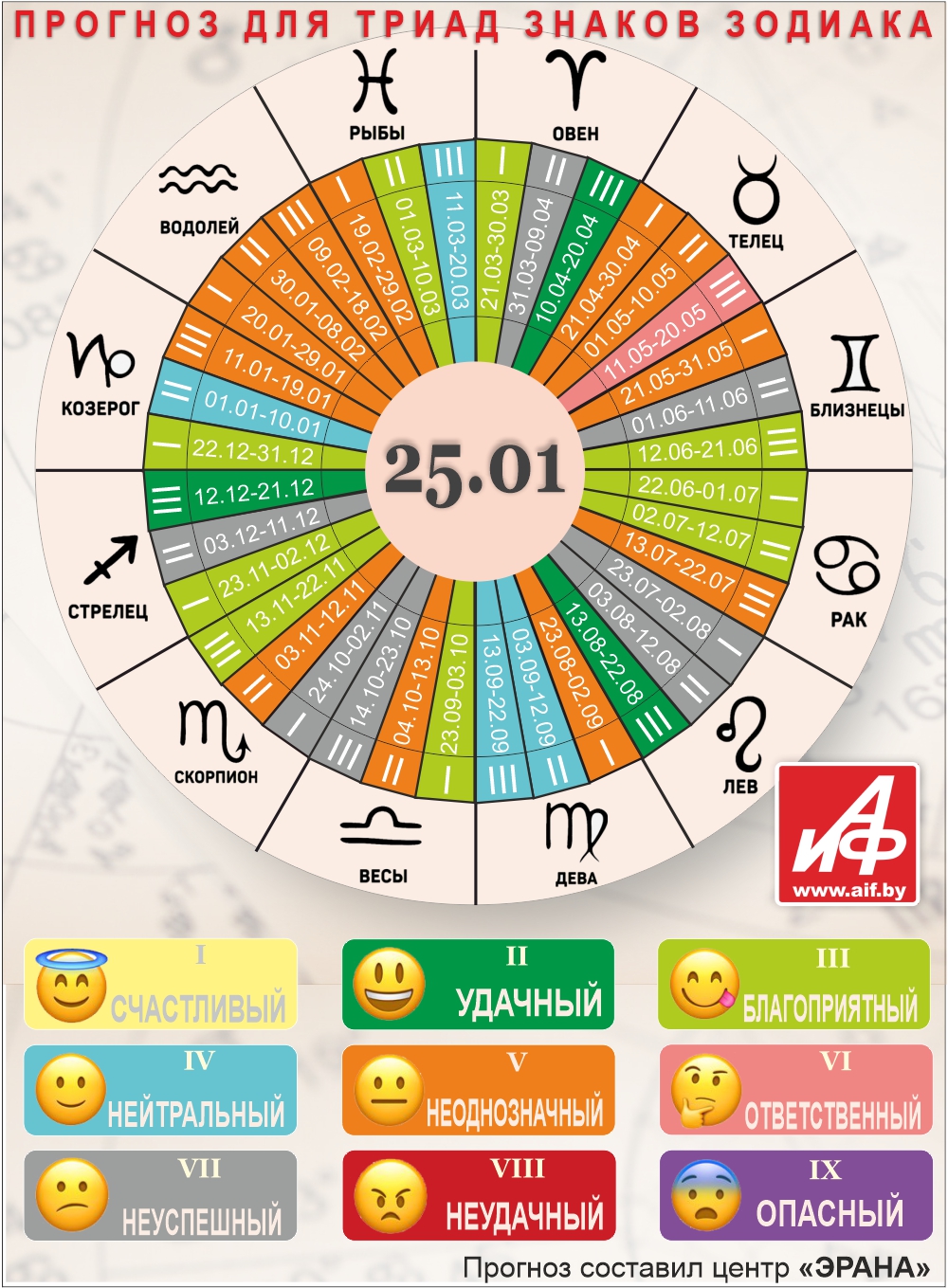 Специалисты центра «ЭРАНА» для точности прогноза представителей каждого знака зодиака делят на три типа по дате рождения, так называемые триады. Каждый из них имеет свои отличительные черты характера и особенности в прогнозах.