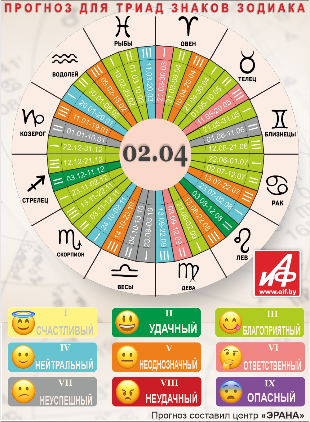 Специалисты центра «ЭРАНА» для точности прогноза представителей каждого знака зодиака делят на три типа по дате рождения, так называемые триады. Каждый из них имеет свои отличительные черты характера и особенности в прогнозах.