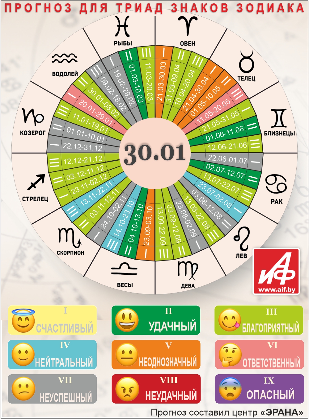 Специалисты центра «ЭРАНА» для точности прогноза представителей каждого знака зодиака делят на три типа по дате рождения, так называемые триады. Каждый из них имеет свои отличительные черты характера и особенности в прогнозах.