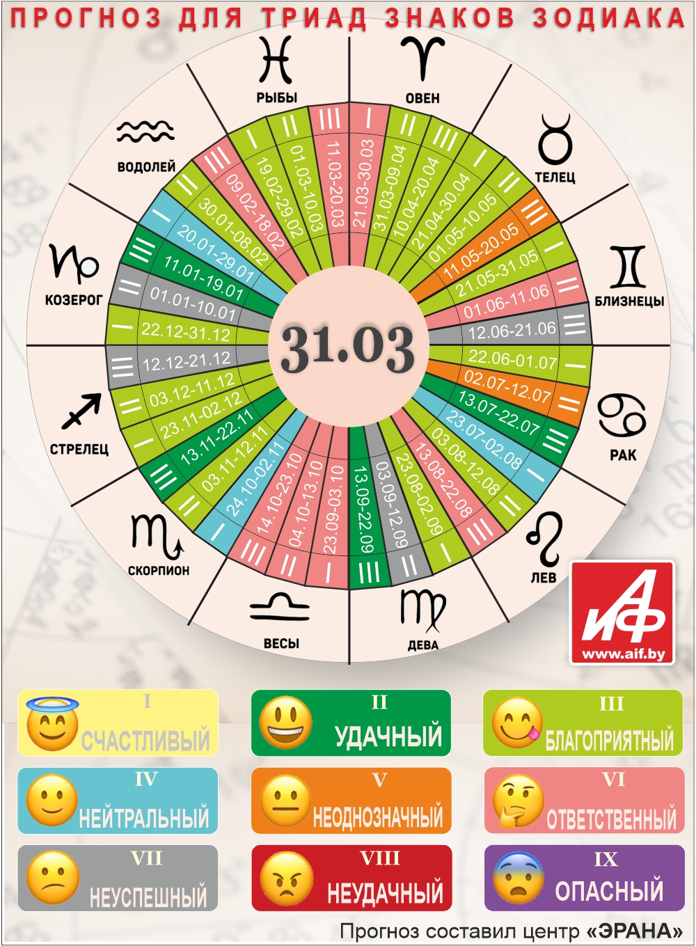Специалисты центра «ЭРАНА» для точности прогноза представителей каждого знака зодиака делят на три типа по дате рождения, так называемые триады. Каждый из них имеет свои отличительные черты характера и особенности в прогнозах.
