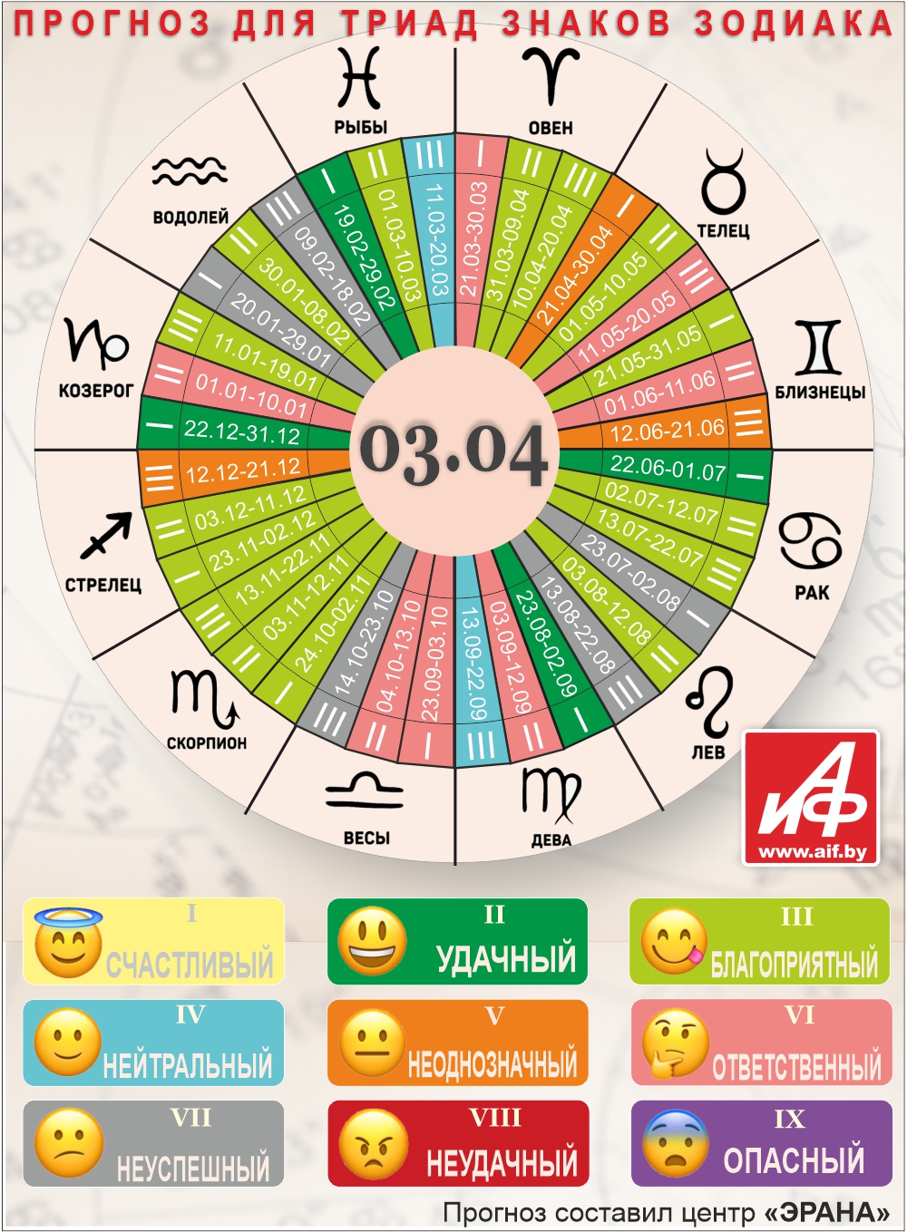 Специалисты центра «ЭРАНА» для точности прогноза представителей каждого знака зодиака делят на три типа по дате рождения, так называемые триады. Каждый из них имеет свои отличительные черты характера и особенности в прогнозах.