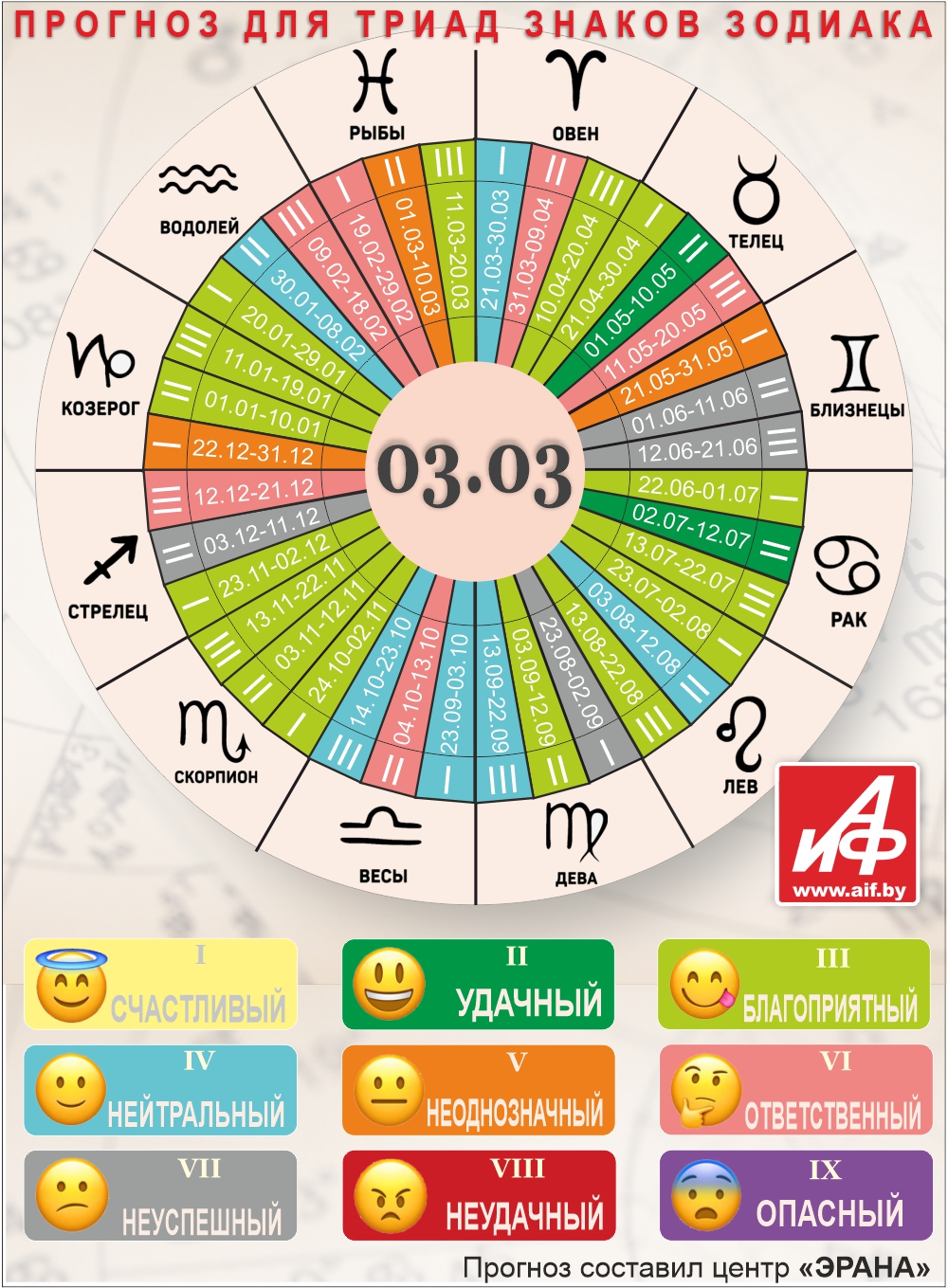 Специалисты центра «ЭРАНА» для точности прогноза представителей каждого знака зодиака делят на три типа по дате рождения, так называемые триады. Каждый из них имеет свои отличительные черты характера и особенности в прогнозах.