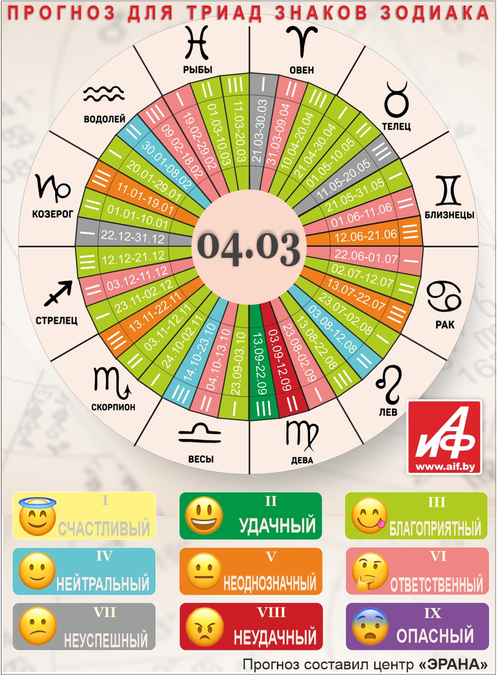 Специалисты центра «ЭРАНА» для точности прогноза представителей каждого знака зодиака делят на три типа по дате рождения, так называемые триады. Каждый из них имеет свои отличительные черты характера и особенности в прогнозах.