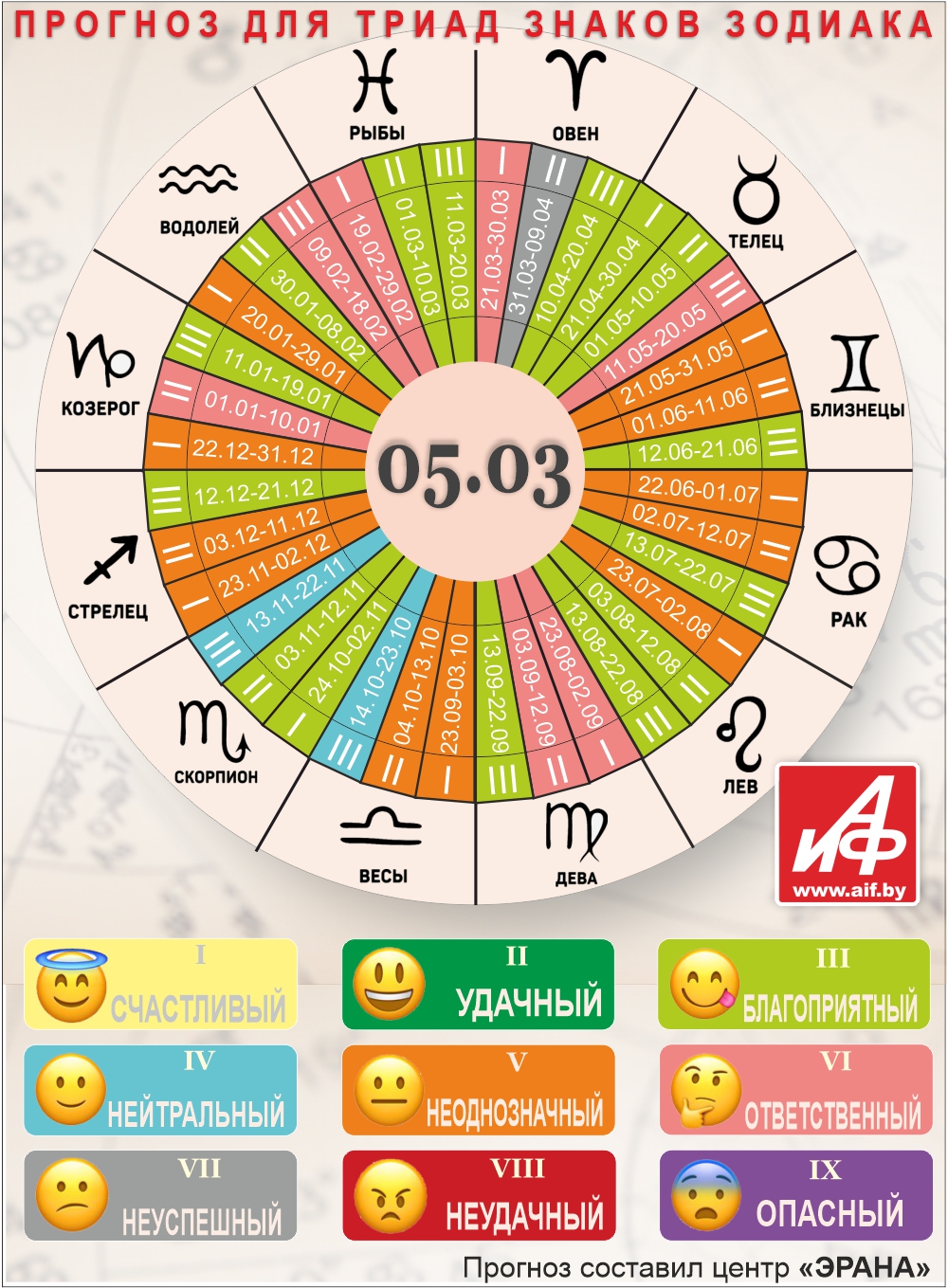 Специалисты центра «ЭРАНА» для точности прогноза представителей каждого знака зодиака делят на три типа по дате рождения, так называемые триады. Каждый из них имеет свои отличительные черты характера и особенности в прогнозах.