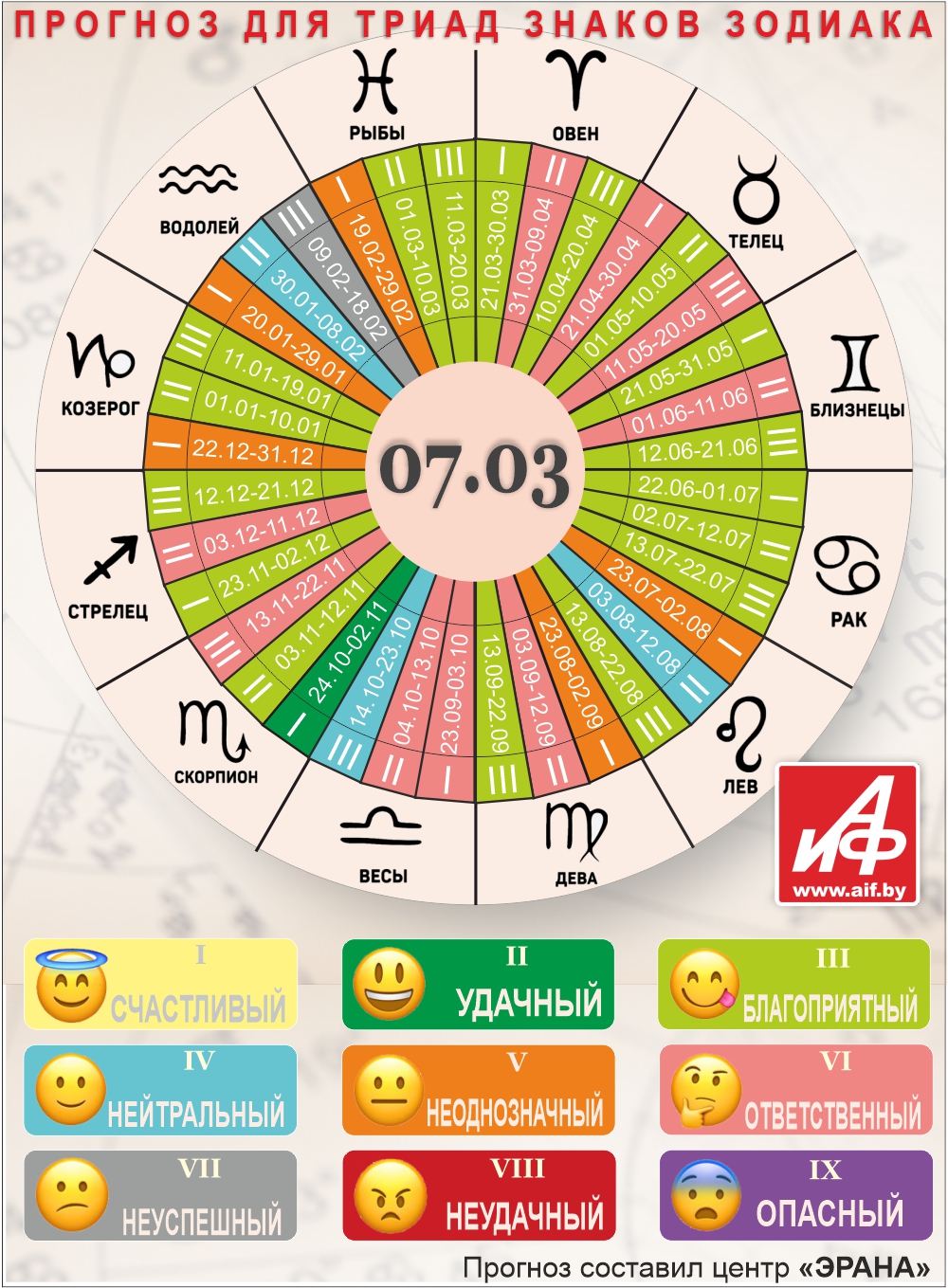 Специалисты центра «ЭРАНА» для точности прогноза представителей каждого знака зодиака делят на три типа по дате рождения, так называемые триады. Каждый из них имеет свои отличительные черты характера и особенности в прогнозах.