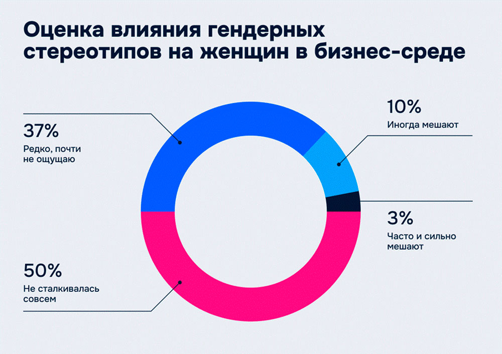 Большинство участниц исследования не ощущают гендерного давления в деловой среде. Половина опрошенных (50%) заявили, что никогда не сталкивались с гендерными стереотипами в бизнесе, а еще более трети (37%) встречают их редко — настолько, что это почти не влияет на работу. Лишь каждая десятая иногда сталкивается с предрассудками, а 3% — часто и сильно.