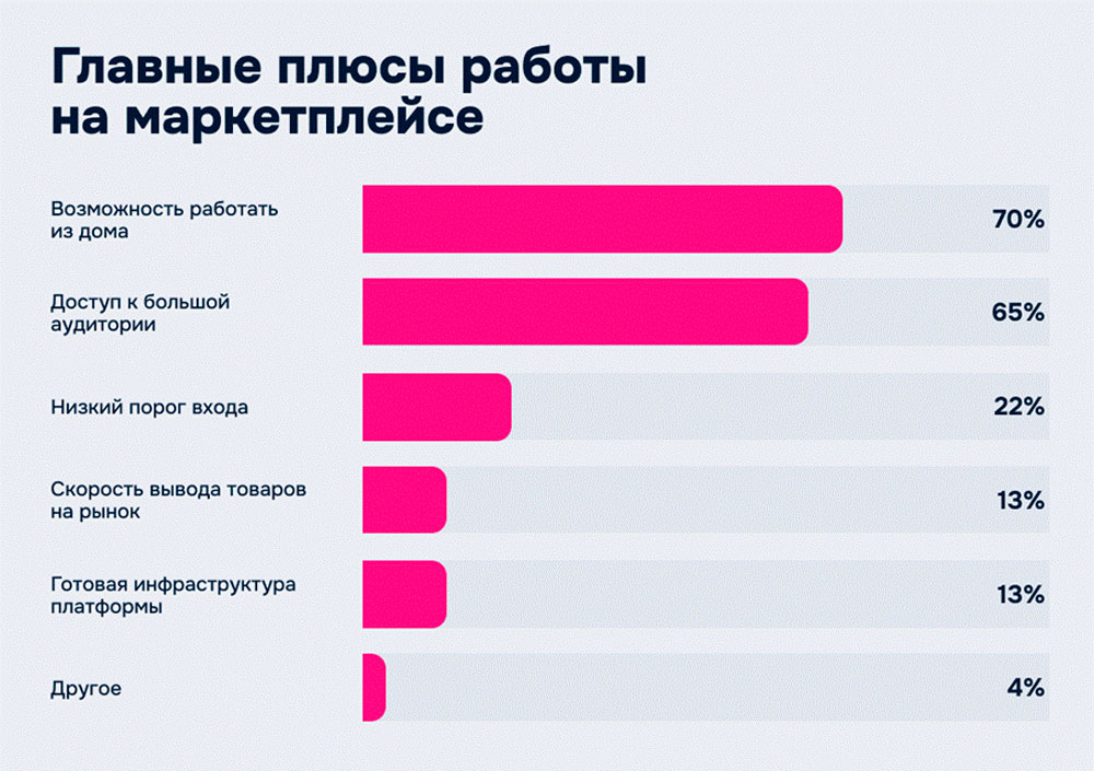 Выстраивать удобный график помогает гибкость модели онлайн-платформ. Большинство продавцов (70%) ценят маркетплейсы за возможность работать удаленно и находить время для дома и семьи. Все благодаря тому, что маркетплейсы берут на себя большинство операционных задач, включая логистику, эквайринг и маркетинг.