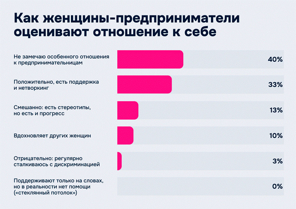 Что касается окружения, 40% респонденток не замечают особого отношения к женщинам-предпринимателям, а треть (33%) чувствуют реальную поддержку. Каждая десятая (10%) знает, что ее пример вдохновляет других женщин на запуск своего дела.