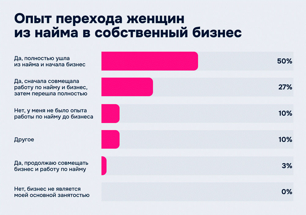 Согласно опросу белорусские женщины демонстрируют решительность при входе в бизнес. Половина опрошенных (50%) уволились с работы и сразу начали свое дело. Еще каждая четвертая (27%) сначала совмещала бизнес с наймом, а затем, убедившись в успехе, полностью переключилась на предпринимательство. Совмещают работу и бизнес по сей день лишь 3%.