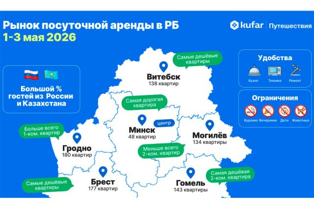 Эксперты сервиса Куфар Путешествия отмечают, что майские праздники традиционно открывают туристический сезон внутри страны. В это время многие планируют короткие поездки на несколько дней, чтобы провести длинные выходные в другом городе. Дополнительный фактор — поток туристов из соседних стран. По словам участников рынка, в начале мая в Беларусь регулярно приезжают гости из России и Казахстана, что усиливает конкуренцию за жилье, особенно в популярных туристических городах. Чаще всего иностранные туристы выбирают Минск, Брест и Гродно, поэтому квартиры в центре этих городов разбирают быстрее всего.