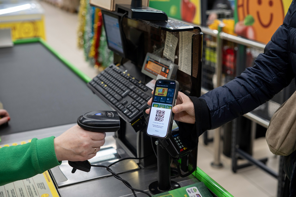 - При расчёте на кассе откройте приложение и нажмите на изображение карты — появится QR-код для кассира или для сканирования на кассе самообслуживания. Также вы можете предъявить при расчете свою физическую карту «МОЙ ГРОШЫК»;