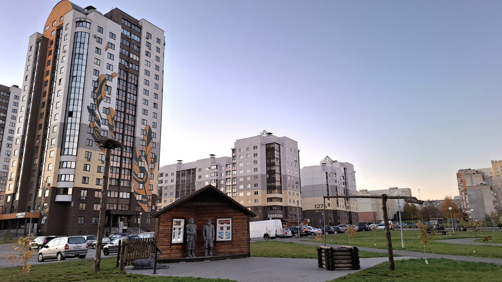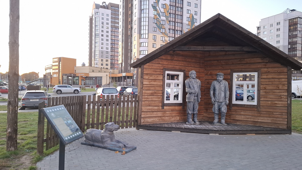 В местах съемок установили арт-обьекты – остановленную Караченцовым катящуюся коляску, деревянные скульптуры главных героев – Федоса, Тимофея и пса Валета у стилизованной деревенской избы и колодца.