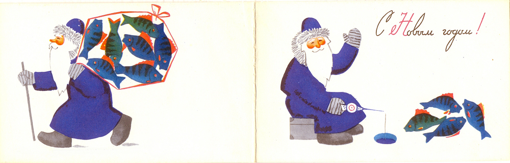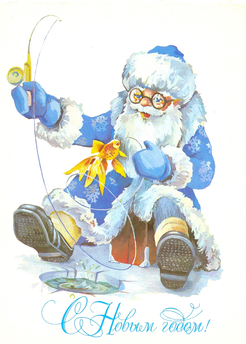 Со знанием новогодних рыболовных традиций работают производители открыток. Изображенные на почтовых отправлениях разнообразные тематические сюжеты вызывают улыбку.