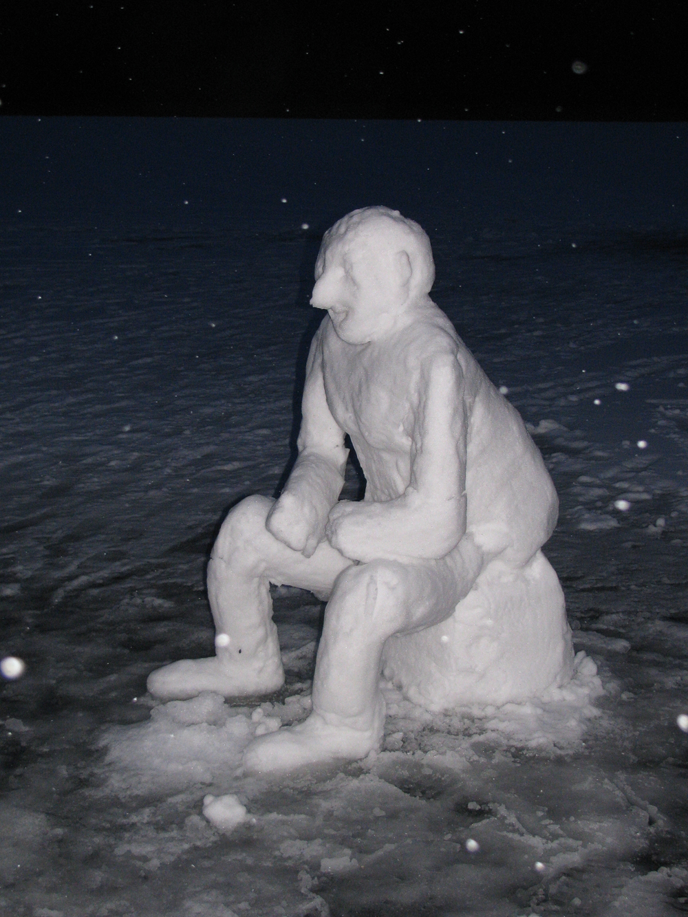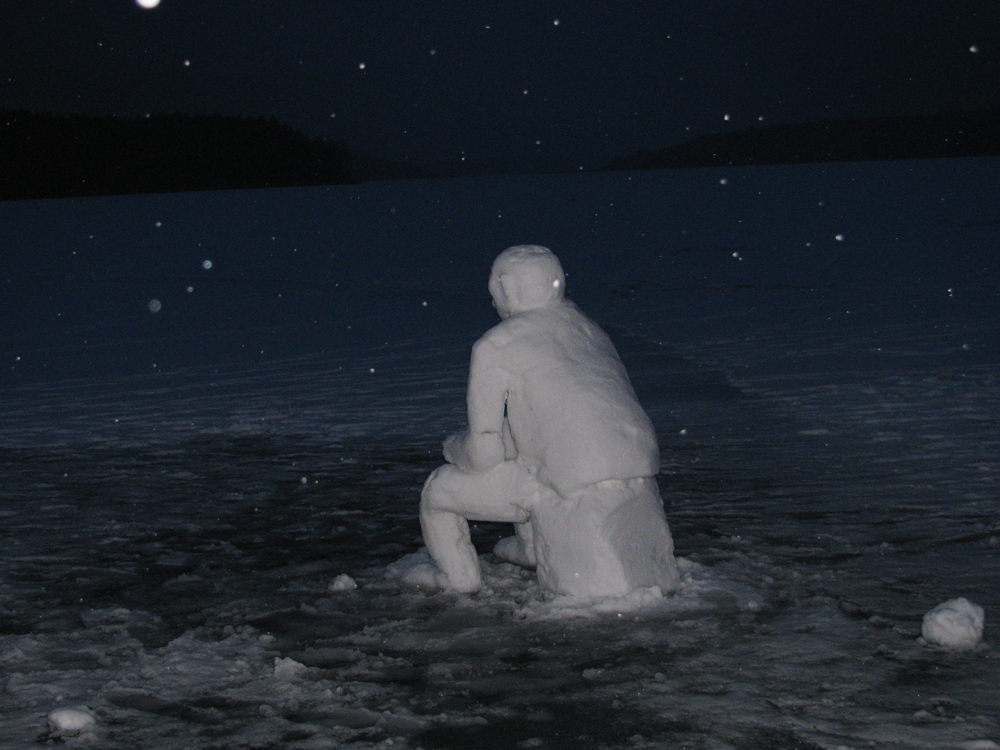 Изображенный на фотографии снеговик-рыболов украшал ледяной настил озера Белое, что в Гродненском районе. Причем издалека выглядел настолько естественно, что большинство непосвященных принимало его за истового удильщика, поражаясь выдержке и терпению.